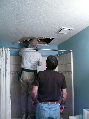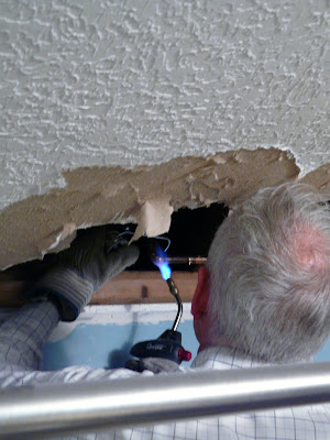 Before we (joe) could patch the ceiling, we (Jim and Joe) had to fix the burst pipe that caused the hole this last Christmas eve.